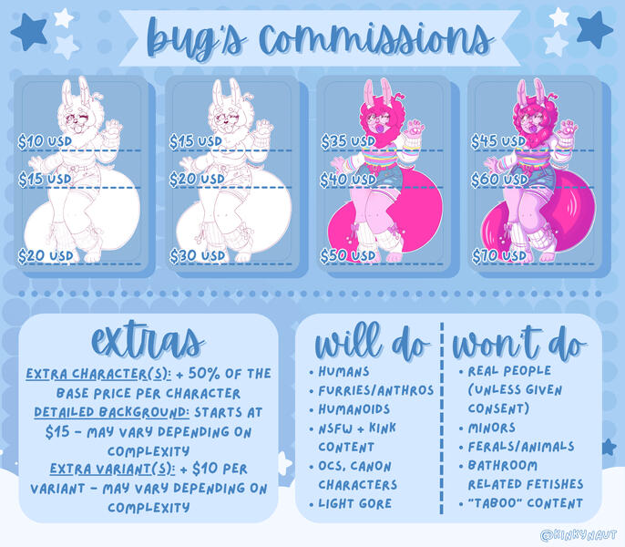 if you're interested in commissioning me, please dm me on twitter or discord and i'll send you a link to my order form and TOS!! my user is @kinkynaut on twitter and @bugtopiia on discordi'll always post updates on twitter and deviantart when i reopen commissions and clarify how many slots are available!