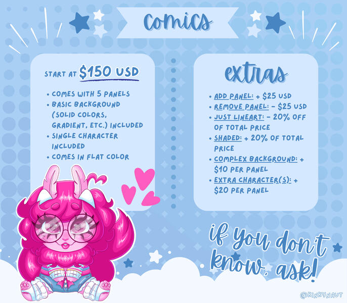 if you're interested in commissioning me, please dm me on twitter or discord and i'll send you a link to my order form and TOS!! my user is @kinkynaut on twitter and @bugtopiia on discordi'll always post updates on twitter and deviantart when i reopen commissions and clarify how many slots are available!